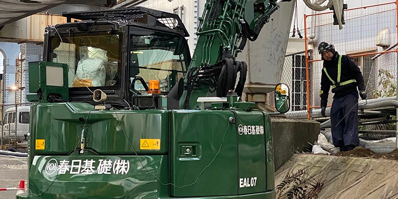 小型杭打機である本機は大型機のように転倒することが無く安全性の高い施工が可能です。フロントにツーピースブーム、エキステンションアームを取付。リーダレス構造となっています。油圧オーガ、バイブロ、ウインチ、上空制限装置、補助エンジンを装着した杭打機です。