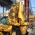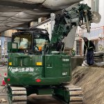 本機は、後方小旋回型となっており従前機と比べてジャッキの張り出しが無いため、駅舎ホーム際、架線柱際、ダブルセンター(線間)作業や上空制限のある場所では高さ制限装置も備えており、架線下の低空頭施工時など線路閉鎖工事において効果的です。載線時においても軌道走行装置自体のジャッキストローク圧で本体を持ち上げるため軌道進入時の効率化が図れます。木製覆工敷設が大幅に低減され、オーガ削孔~注入~建て込み~ゼロバイブロによる定着~打設といった一連の施工を円滑に行えます。 軌道走行部は1067mm、1372mm、1435mmの軌間に対応できる構造になっています。